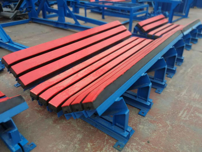 緩沖床主要用于替代緩沖托輥,緩沖床由緩沖條組成,而緩沖條主要應用優(yōu)良的高彈性特種橡膠層充分有效吸收了物料下落時的沖擊力,大大降低了物料下落時對輸送帶的沖擊,真正的改善了落料點的受力狀況。并采用特殊的UHMW高分子聚乙烯表面,使輸送帶與緩沖條之間的摩擦系數(shù)降到最低,且耐磨性好。緩沖床的使用保證了輸送帶的面與面的接觸,受力均勻,有效防止了由于托輥斷裂、脫落造成的皮帶縱向撕裂,同時大大降低了皮帶被銳器或尖銳物料穿透后縱向撕裂的概率。